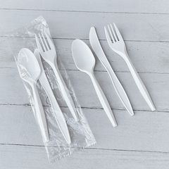 Utensils Type: Fork; Knife; Spoon; Material Type: Plastic; Material(s): Polypropylene; Color(s): White.